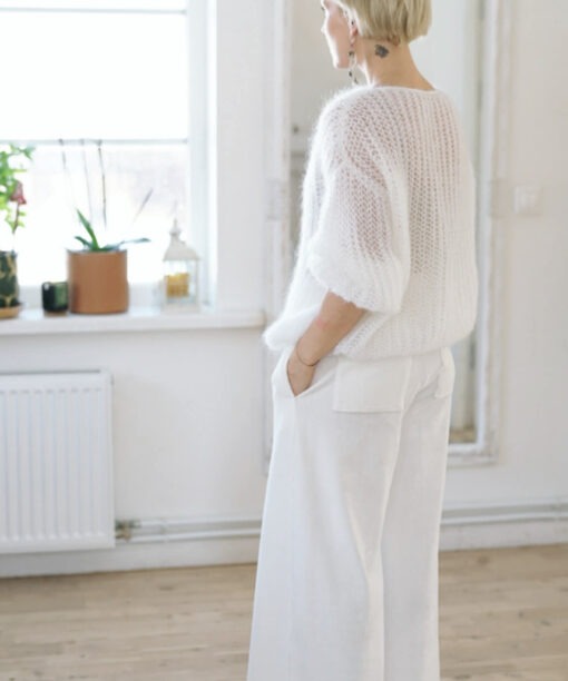 Baltos spalvos veliūrinės platėjančios kelnės