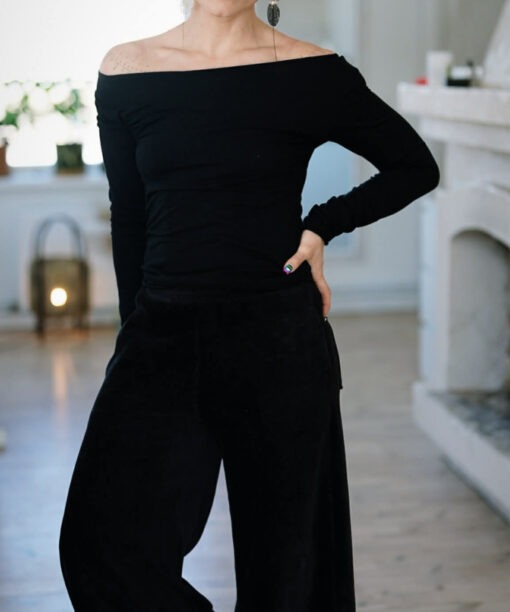 Juodos spalvos veliūrinės platėjančios kelnės