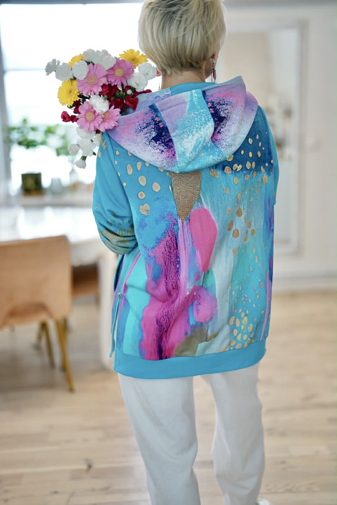 Sudėtis : 97 proc. medvilnė, 3 proc. elastanas Džemperio ribai ir kapišono vidus iš minkšto veliūro, suteikia išskirtinį akcentą.