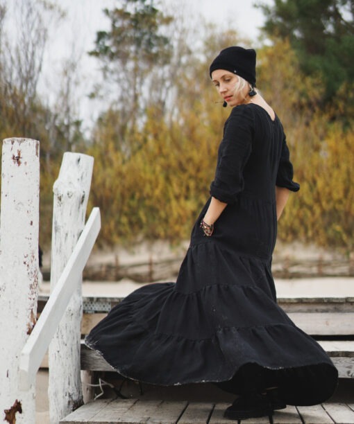 Šonuose yra patogios kišenės. Suknelės ilgis 140 cm.