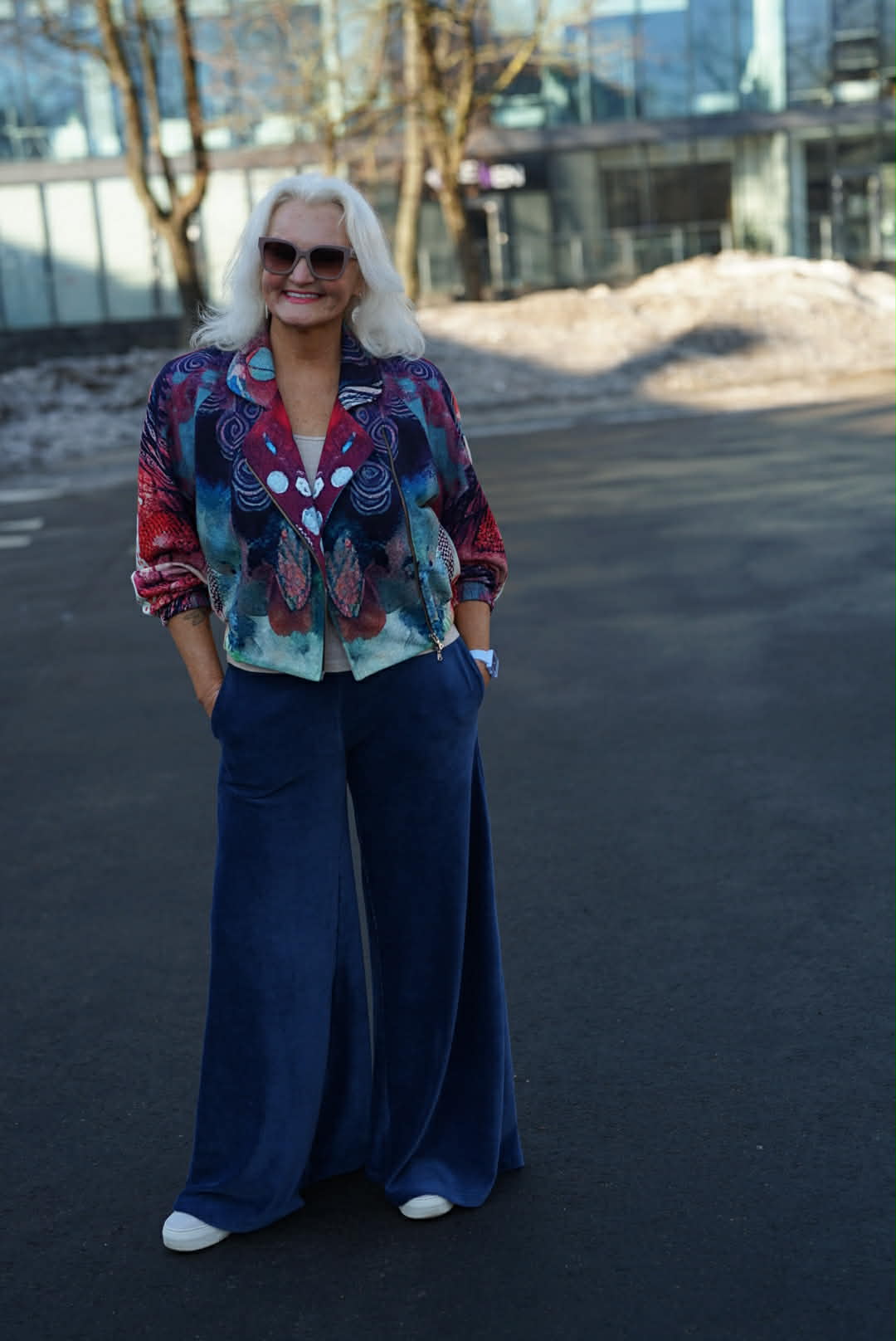 Tamsiai mėlynos spalvos veliūrinės platėjančios kelnės
