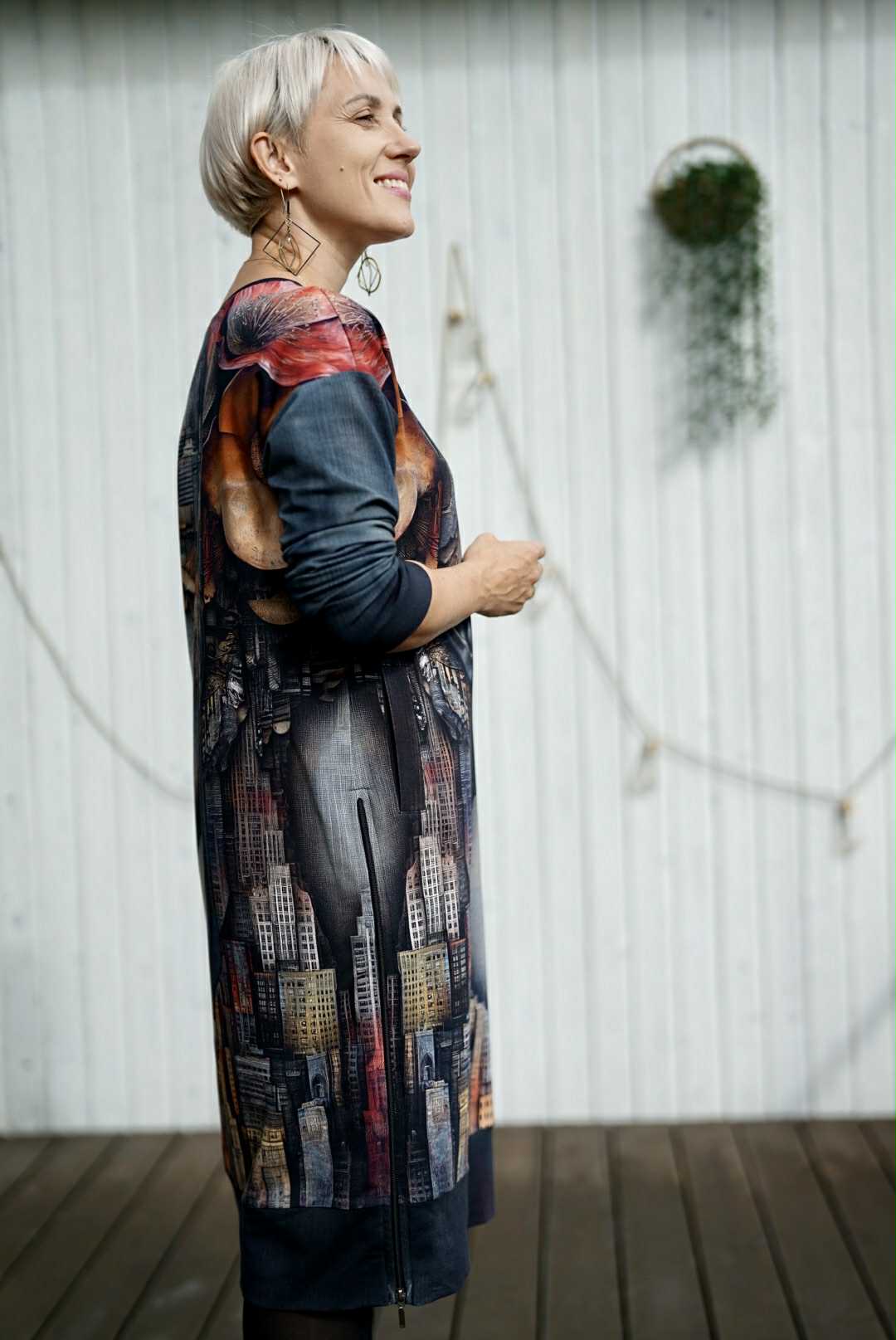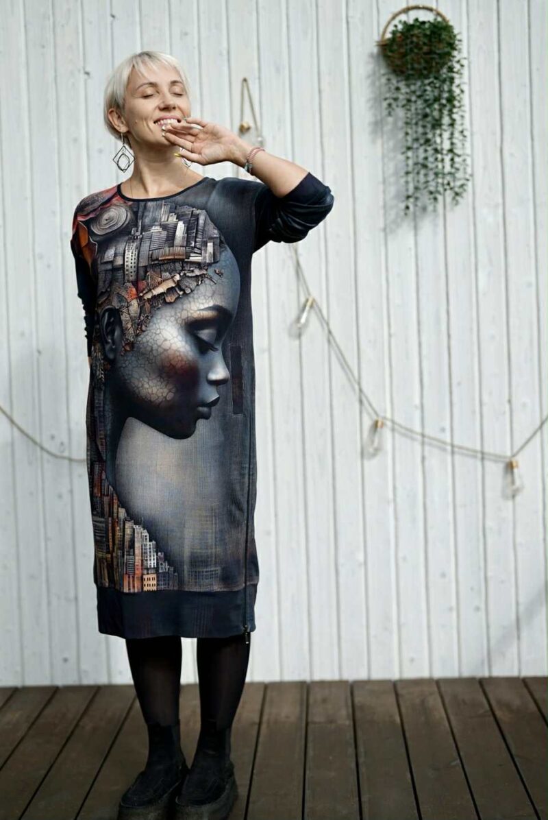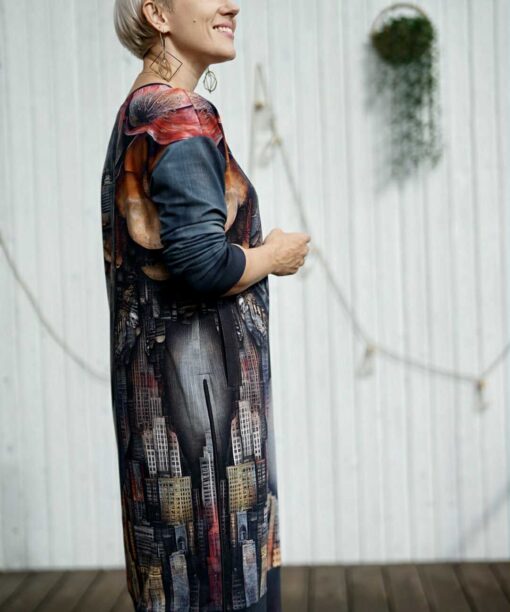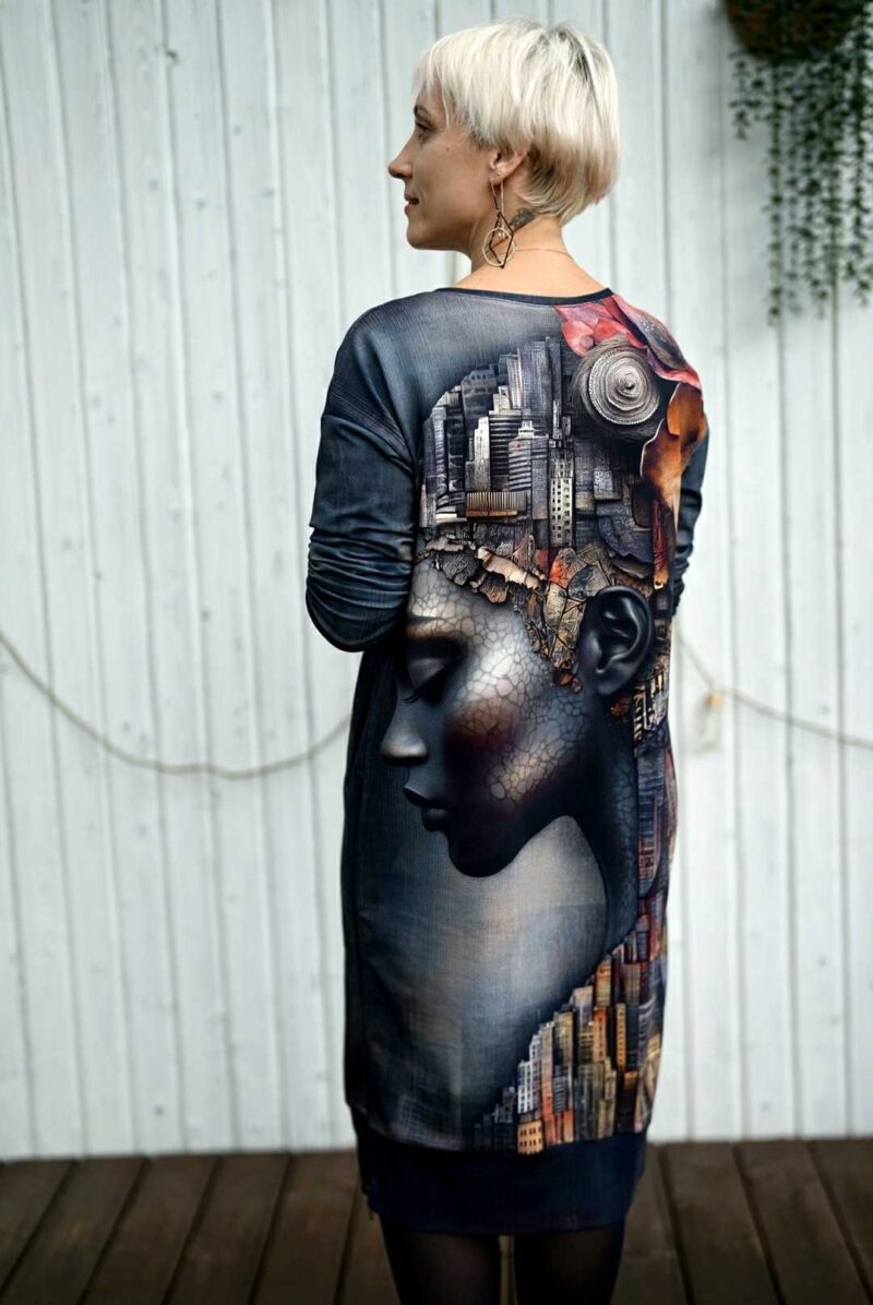Sportinio stiliaus oversized (laisvo kirpimo) suknelė/prailgintas džemperis „Miesto mūza“ sukurtas nevaržančius ir stilingus rūbus mėgstančioms moterims. Suknelės šonuose yra užtrauktukai, kuriuos pilnai atsegus suknelę galima dėvėti ir kaip prailgintą tuniką ant kelnių ar džinsų.