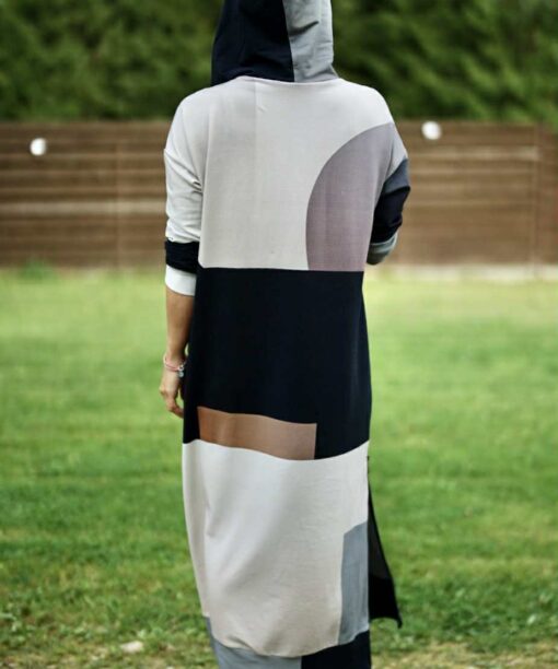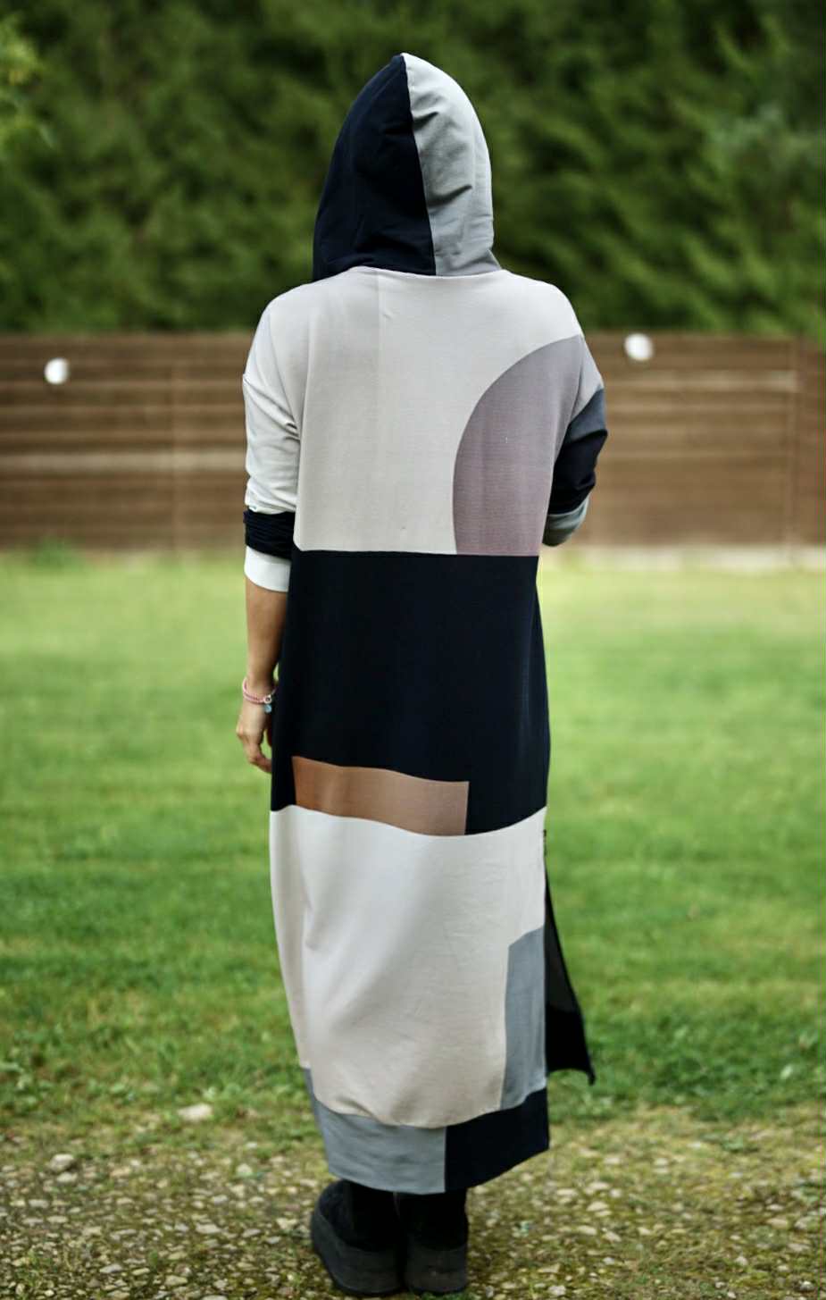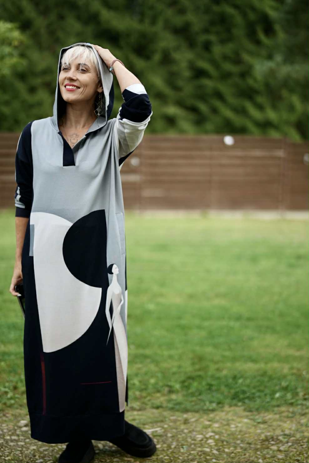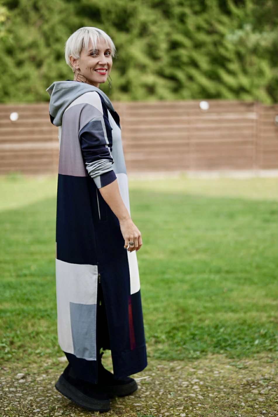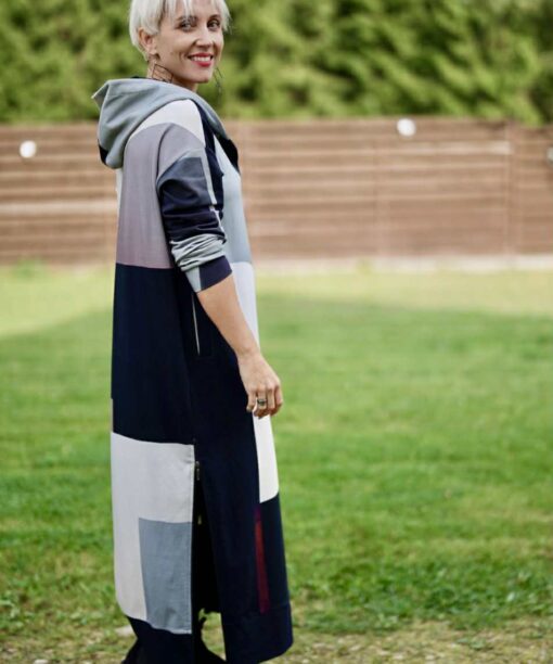 Laisvalaikio suknelė su kapišonu puikiai tinka sportinio stilio mėgėjoms, laisva, nevaržanti judesių. Šonuose su užtrauktukais todėl dėvėjimo variacijų tikrai daug. Galimi 4 ilgiai : 95 cm, 102, 120 ir 130 cm.