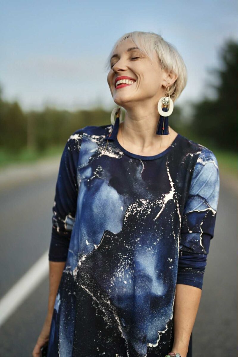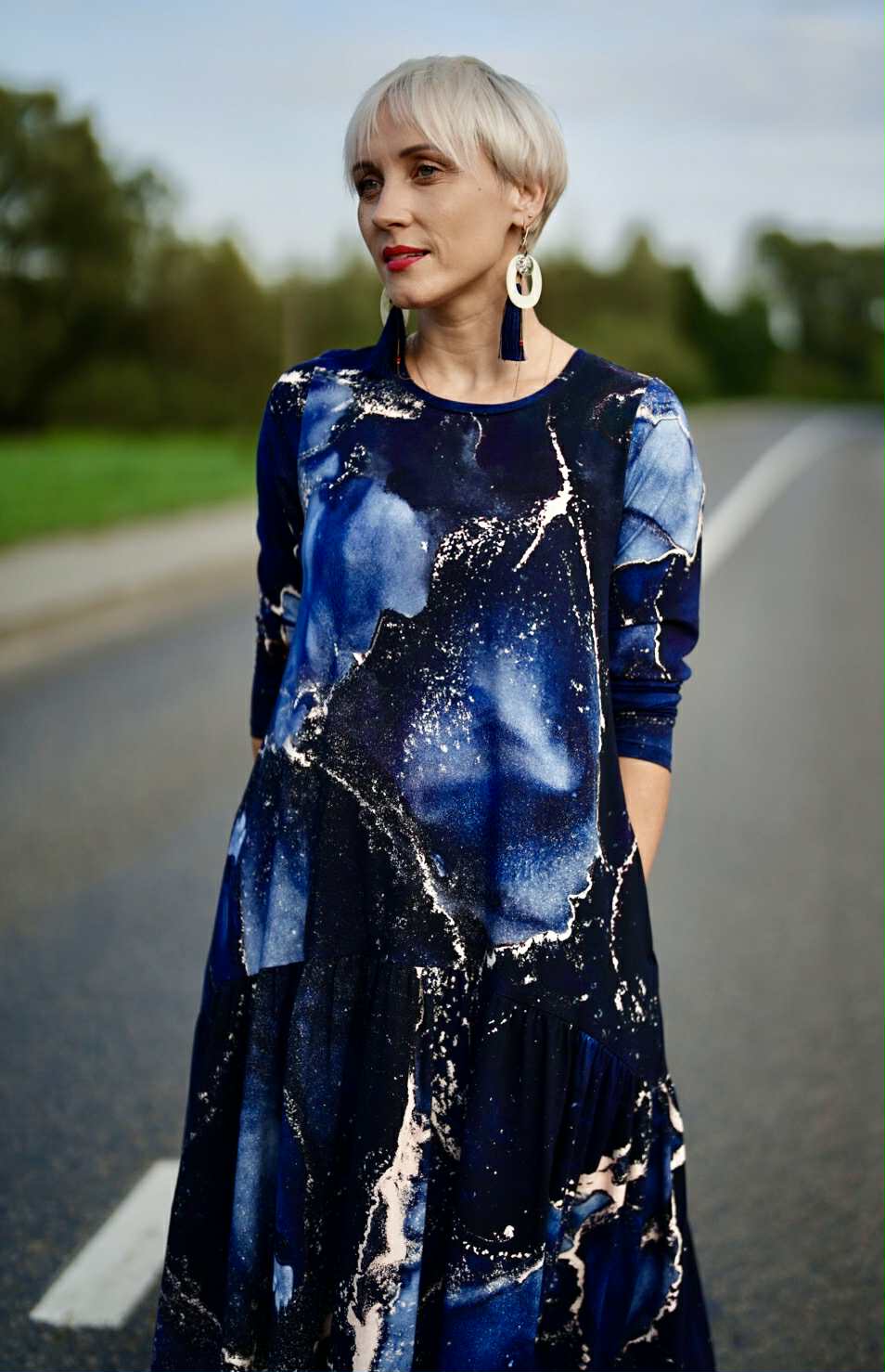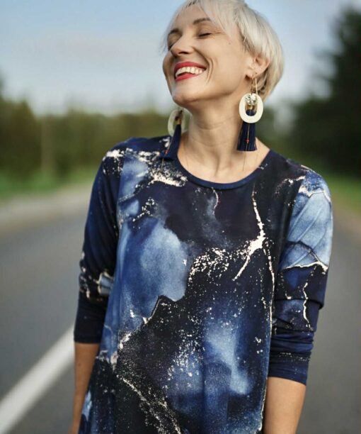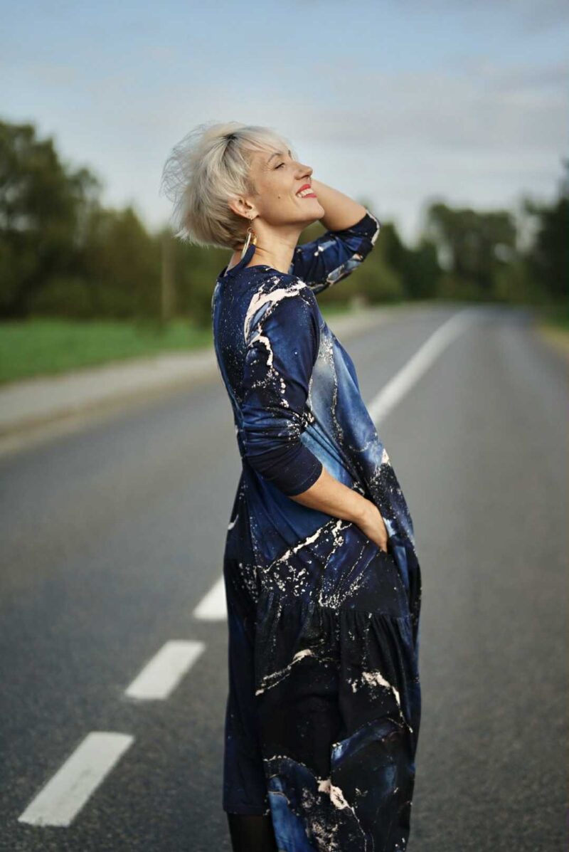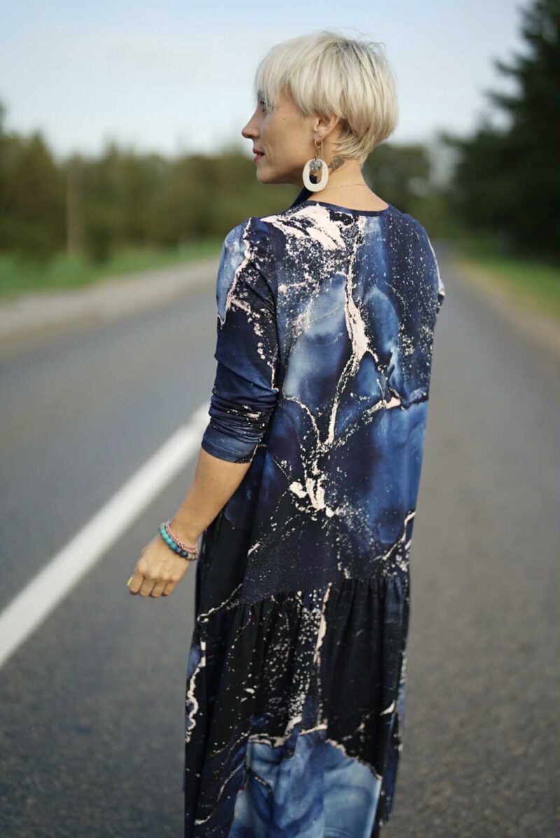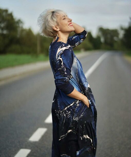 Mėgiama ir visoms progoms puikiai tinkanti platėjančio MIDI modelio suknelė “Mėlyni galaktikos šnabždesiai”. Suknelės šonuose yra patogios kišenės.